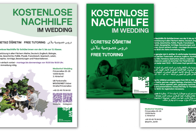 Biz Proje SprInt Berlin Wedding Semtinden geliyoruz. Biz Göçmen Ailelerin Öğrencilere Derslerinde, Sinav icin öğrenmelerine ve Okul Problemlerine yardim etmek icin burdayiz. Bizim Öğretmenler Üniversitede Öğretmenlik okuyorlar veya Liseyi bitirmiş Öğrenciler. Çocuklarla ayni Ortamda iyi bi bağlanti kurmak icin toplanmis bulunuyorlar. Bizim burda sundumuz herşey bedava ve Çocuğunuzu kayit etminize gerek yok. Çocuğunuzla beraber gelin ve bizim sundumuz Projeyi görün ve ona göre karar verin.