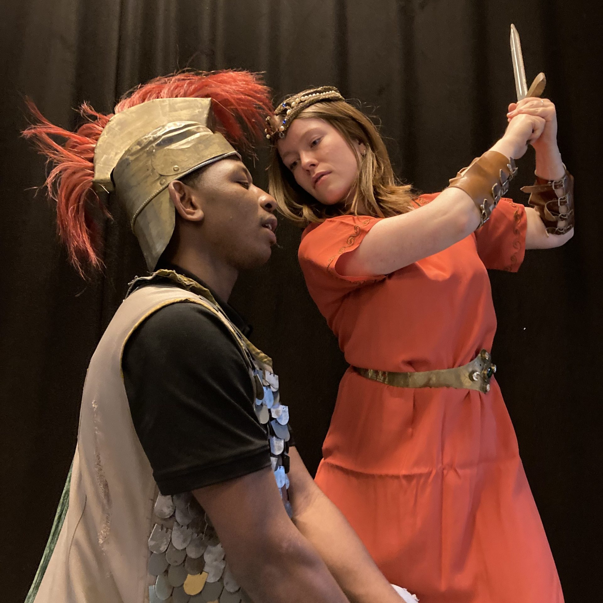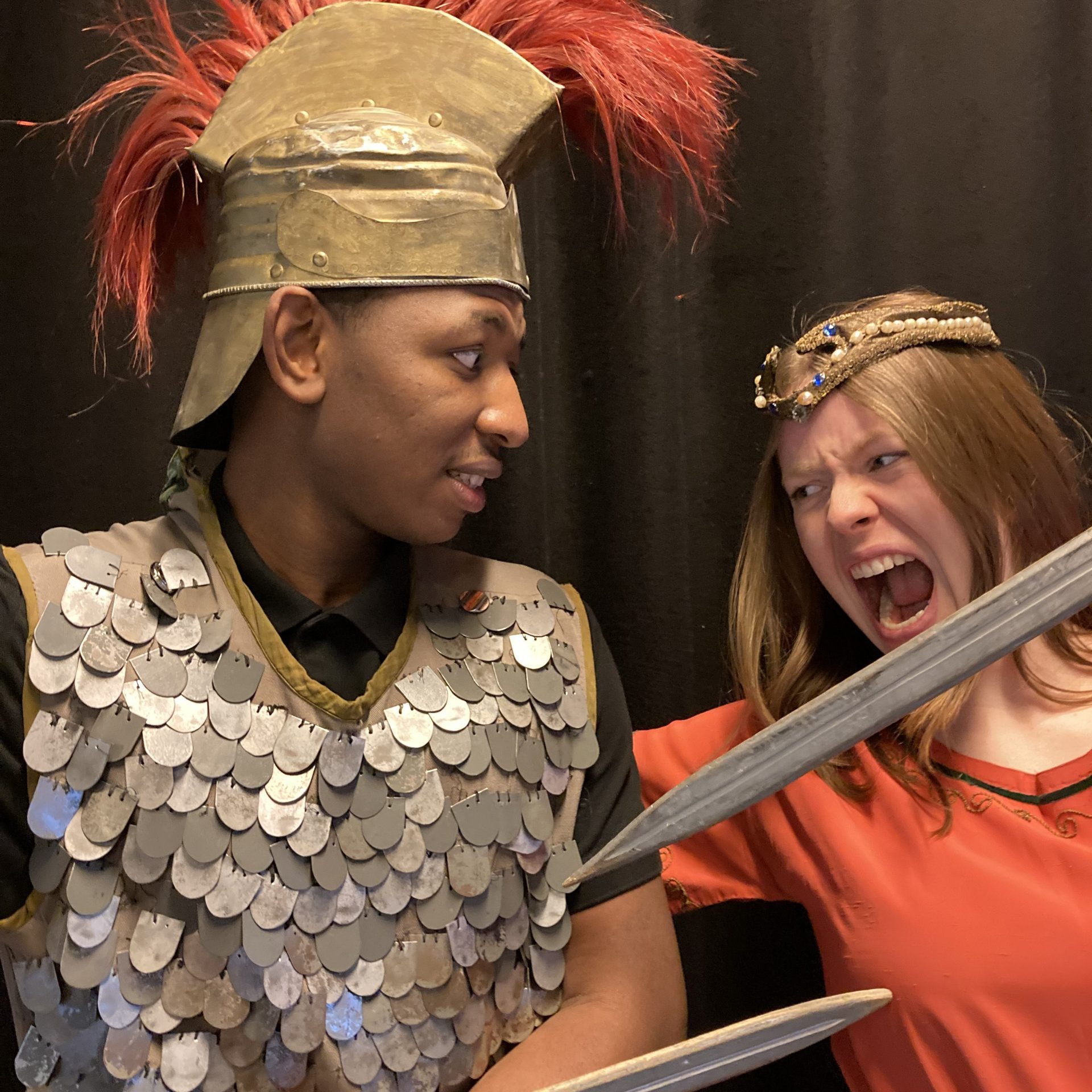 Aber worum gehts eigentlich in dem Stück? Ohne zu viel verraten zu wollen — das Stück ist eine Komödie, angesiedelt im antiken Griechenland, in dem drei griechische Soldaten kurz vor Troja ihr Heer verlassen und in das sagenumworbene Amazonenreich eindringen, um das dortige Matriarchat als Frauen verkleidet zu infiltrieren. Thematisiert werden also Geschlechterbilder, aber auch andere aktuelle Themen wie Demokratie und Diktatur, Krieg und Frieden. Formal orientiert sich das Stück am griechischen Theater, lässt seine Figuren aber in zeitgemäßer Sprache sprechen: „Natürlich ist Amazonen von Thor Truppel ein politisches und ein zum Nachdenken anregendes Stück, aber in erster Linie finde ich es sehr unterhaltsam und witzig: Die Texte machen einfach großen Spaß.“, sagt Çiğdem, unsere FSJ-Kraft, die die Amazonenkönigin Penthesilea spielt.