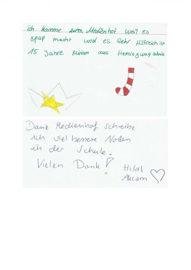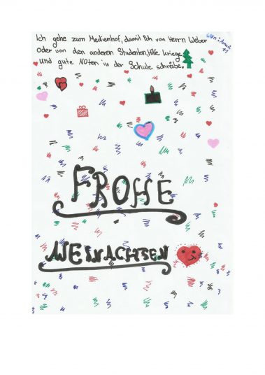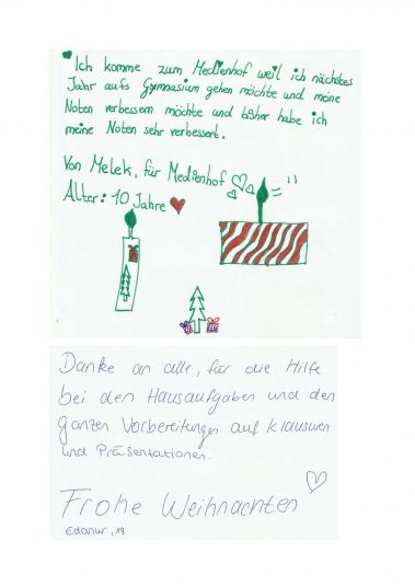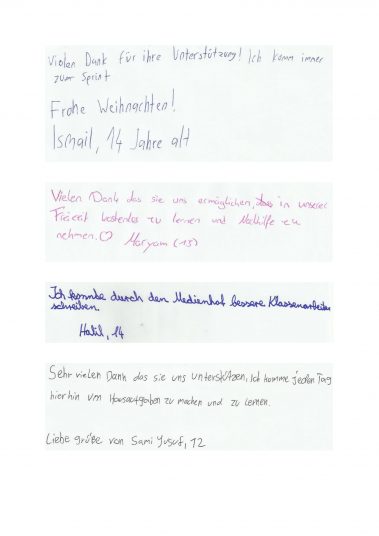Aber auch die anderen Schüler und Schülerinnen aus unserem Projekt möchten sich bedanken. Deshalb haben sie Weihnachtsgrüße verfasst und eine Dankeskarte an unsere Spender geschickt, die wir euch an dieser Stelle nicht vorenthalten möchten! Werft bitte einen Blick in die nebenanstehende Galerie, um euch selbst einen Eindruck zu machen.