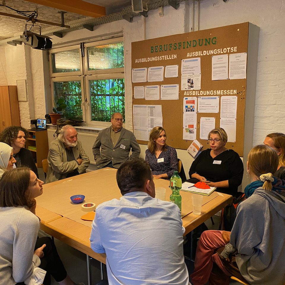 Ute, zeitweilige Förderlehrerin bei SprInt, moderierte den Tisch, an dem Regina Kittler von den Linken saß: „Wir waren eine tolle Runde, bunt gemischt aus Schülerinnen und Schülern, Lehramtsstudierenden, einem Erzieher, einer Schulleiterin, einer Grundschullehrerin. Die Diskussion verlief sehr produktiv und Regine Kittler hat sich alles sehr aufmerksam angehört, aber auch eigene Standpunkte vorgestellt, die man aus der linken Bildungspolitik kennt, wie beispielsweise das produktive Lernen. Das fand ich spannend“ erzählt Ute von ihren Erlebnissen. Ähnlich angetan ist Ayla, die mit am Tisch von Ute und Frau Kittler saß: „Es war toll, wie Frau Kittler auf Augenhöhe mit uns diskutiert hat.“ An den anderen Tischen diskutierten die Politikerinnen ebenfalls mit vielen Schülern, Lehrern, Eltern sowie Vereins- und Verwaltungsvertretern aus dem Kiez. Eine Stunde lang war nur das angeregte Brummen der intensiven Gespräche zu hören.