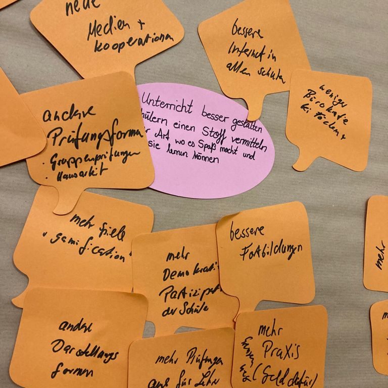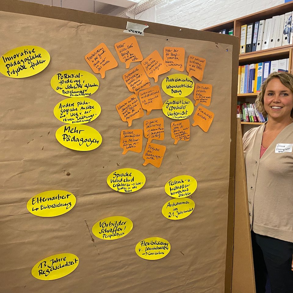 Nach der Diskussion stellten die Moderatoren ihre Ergebnisse vor. An einer Pinnwand zeichneten sie den Plan für eine bessere Bildung im Kiez auf. Im Vordergrund stand bei vielen, die Lernmotivation von Kindern und Jugendlichen mit zielgruppenspezifischeren Angeboten zu stärken. Andere Vorschläge waren: mehr Zeit für reinen Unterricht durch Ganztagsschulen, weniger Stundenausfall und weniger Bürokratie für Lehrer, andere Prüfungsformen wie Hausarbeiten oder Gruppenprüfungen, besseres Internet, bessere Aus- und Fortbildungen für Lehrer, mehr Kooperation mit außerschulischen Einrichtungen, mehr Schulautonomie, mehrsprachige Schulen, Sprachförderung, Frühkindliche Bildung, mehr Kitaplätze… Der offizielle Teil der Veranstaltung war nach zwei Stunden mit guten Ergebnissen beendet.