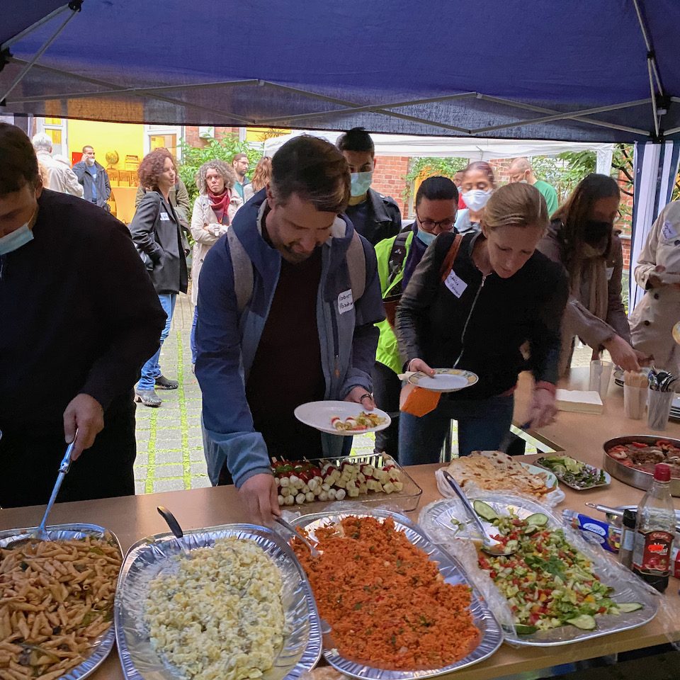 Glücklicherweise gab es nach der Diskussion für den Kopf auch etwas für den Bauch: ein paar Mütter aus dem Kiez hatten ein arabisches Buffet vorbereitet: Couscous, Falafel, Hähnchenspieße tischten sie unter anderem auf. Als alle sich die leckeren Speisen auf den Teller luden, hörte es auf zu regnen. Ein Omen? Vielleicht. Andererseits bemerkte eine der anwesenden Kiezmütter treffend: „Wir haben viel über mögliche Lösungen geredet. Aber ob sie auch in die Tat umgesetzt werden? Ich weiß es nicht.“ Wir von SprInt meinen zumindest: ein Anfang ist gemacht und glauben, dass solche Veranstaltungen wirklich etwas verändern können: Die ehemalige Lehrerin Dr. Maya Lasić von der SPD zum Beispiel hat noch lange weiter mit unseren Lehramtsstudenten diskutiert – auch nach Ende der Veranstaltung. Trotz aller Probleme sind wir optimistisch, dass die Politiker und Politikerinnen einiges aus dem dritten Hinterhof im Wedding ins Abgeordentenhaus mitgenommen haben.
