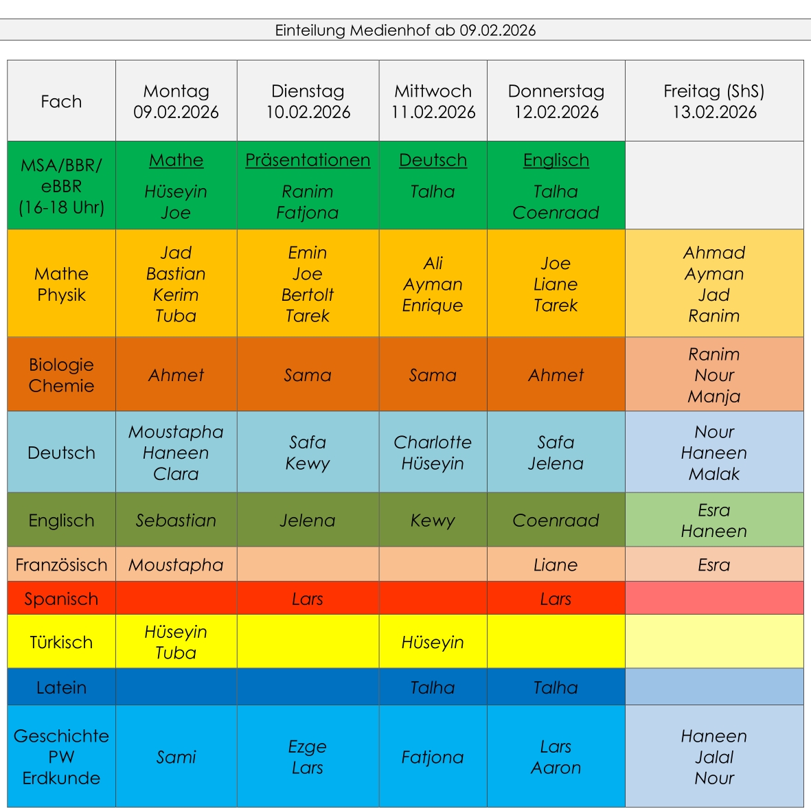 Hier der Einteilungsplan für die kommende Woche. Schaut vorbei!